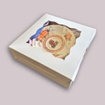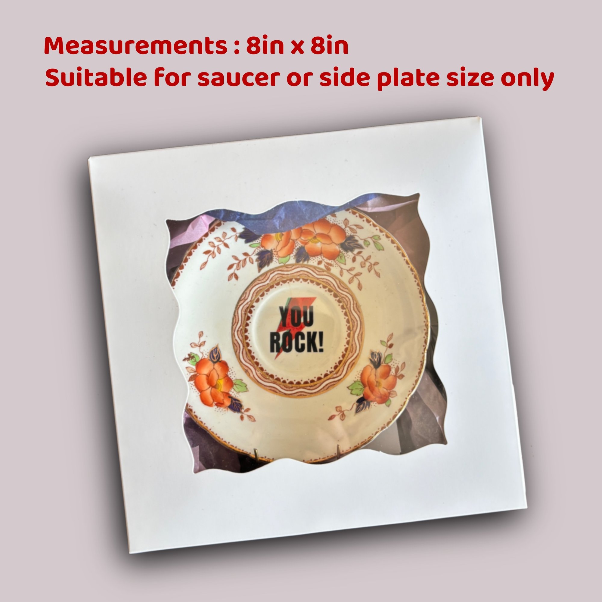 The 8" x 8" square gift box features a clear window, showcasing the upcycled vintage plate upon opening.